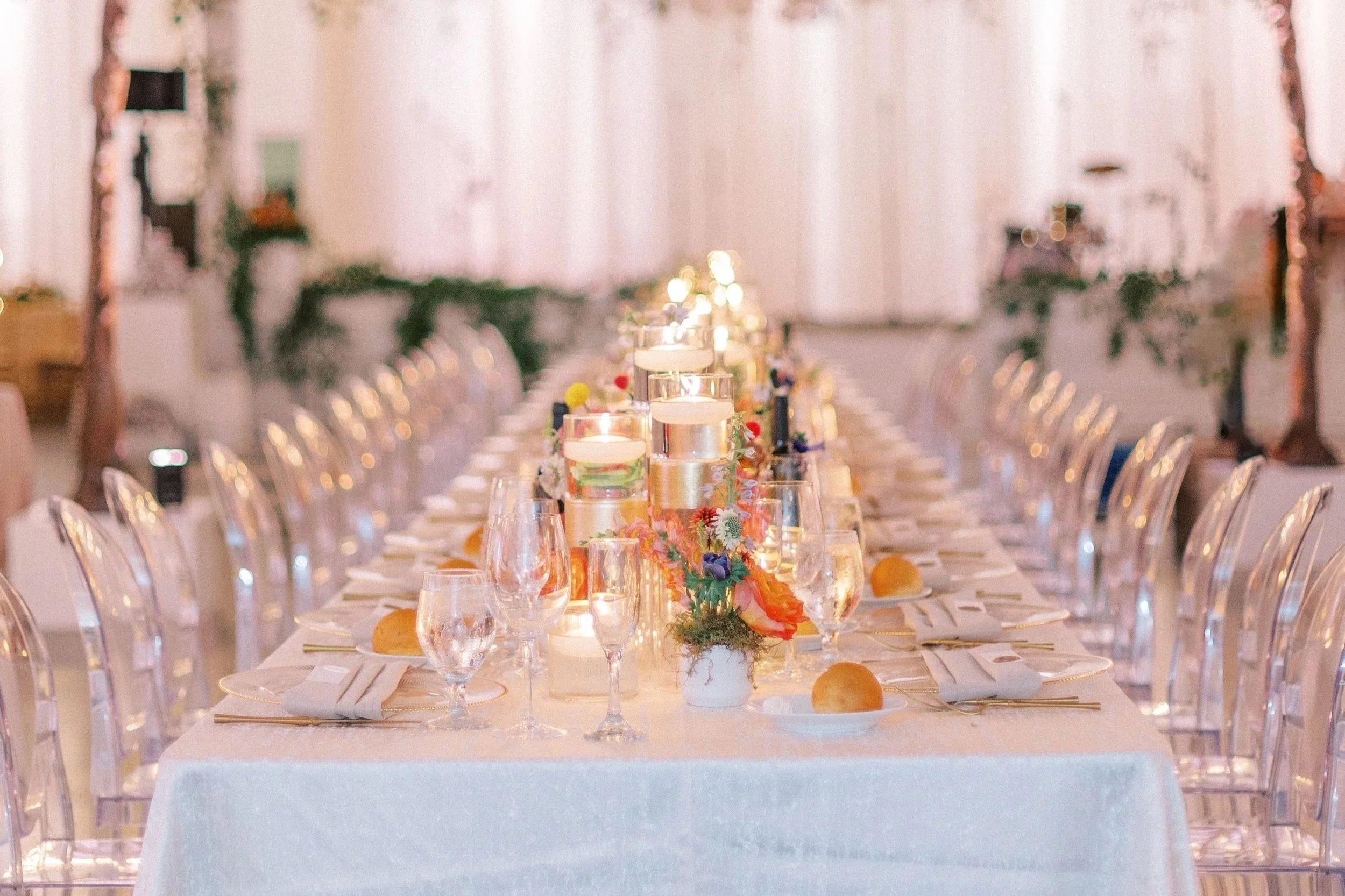 At the Empire Room: perfect for fall or winter hues, take advantage of the high ceilings with tall centerpieces and special installations.